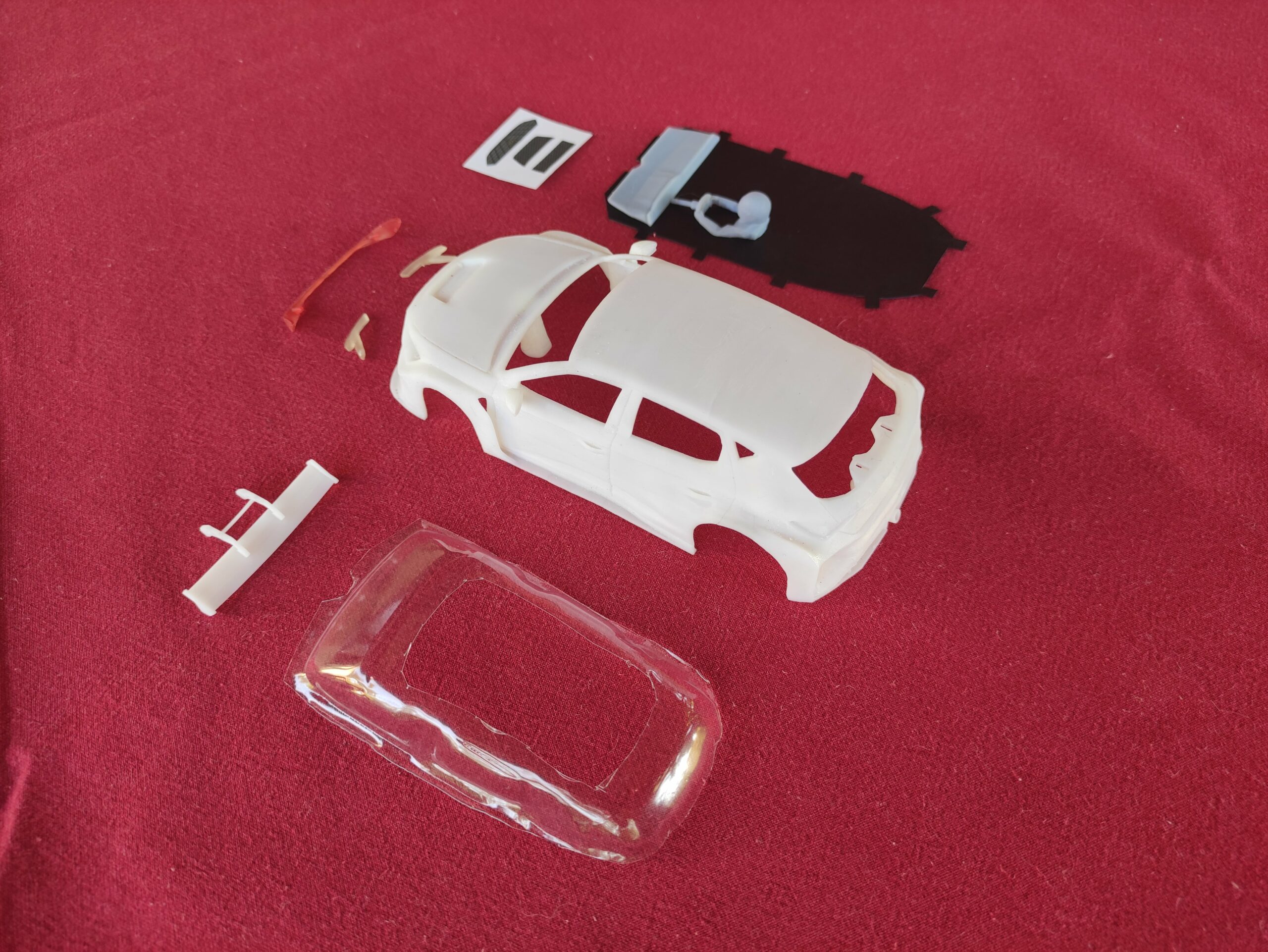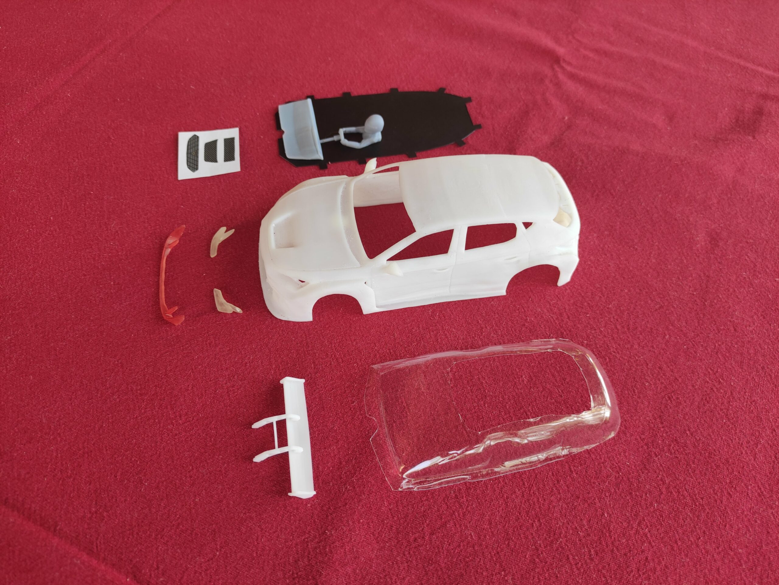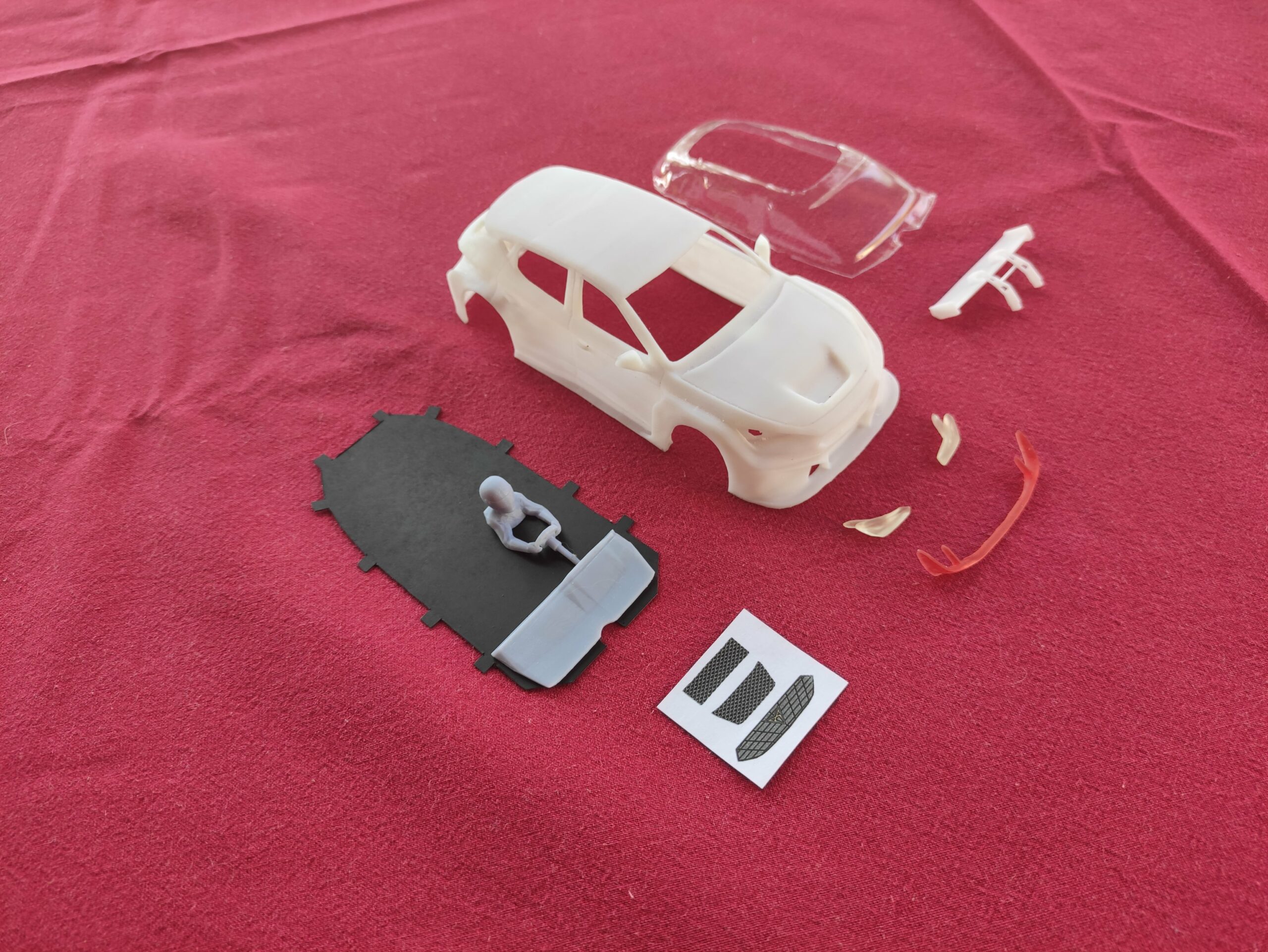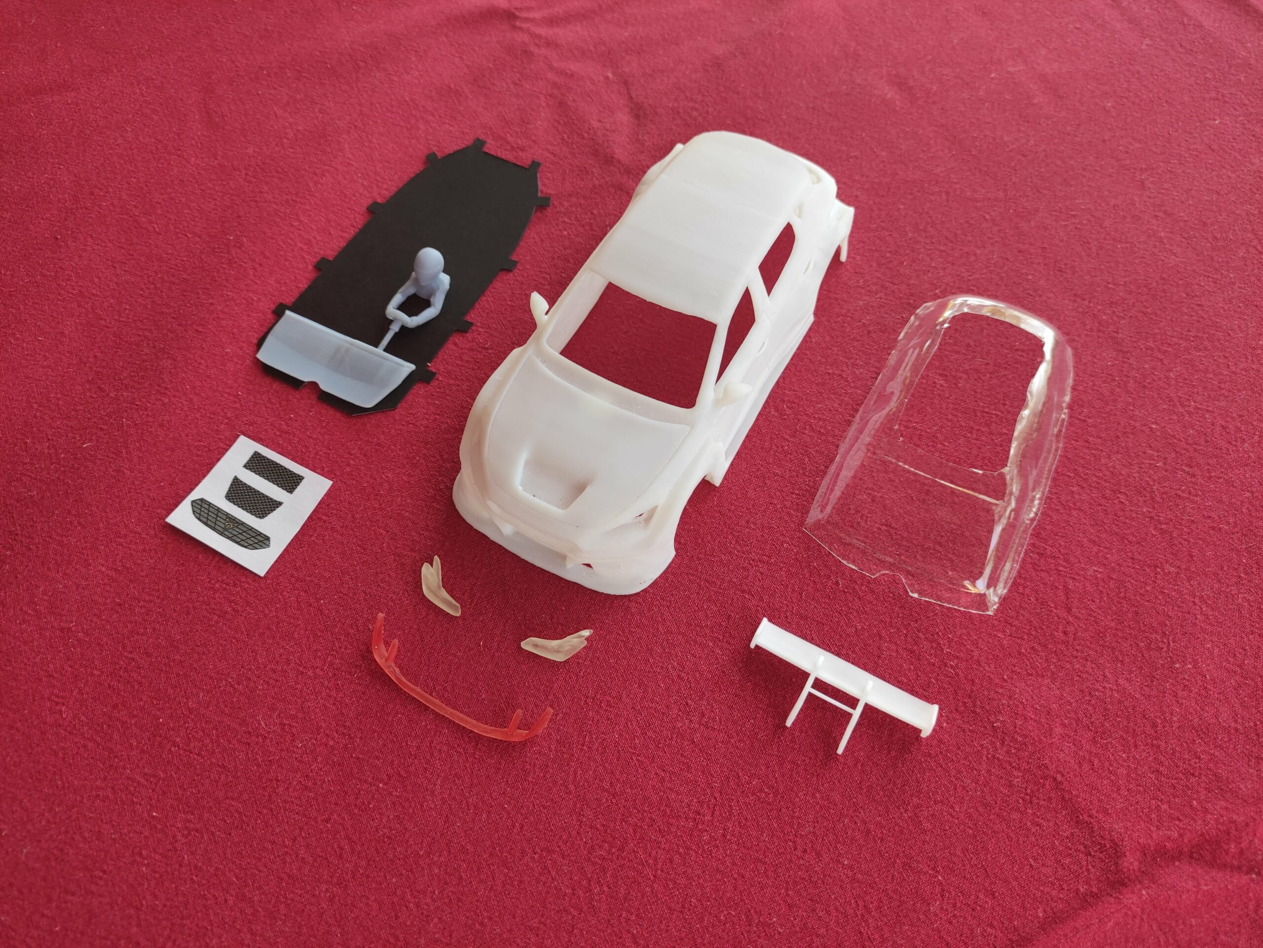 La carrosserie et toutes les pièces sont imprimées en résine, avec un mélange qui allie solidité et flexibilité afin de prévenir la casse. Le kit complet comprend :
